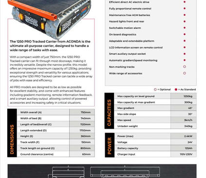 The 1250 pro is a compact, all-purpose electric tracked carrier designed to transport loads up to 1,250 kg through very narrow and confined spaces. It can fit through most standard doorways.