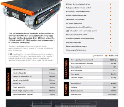 is a compact, all-electric tracked carrier (formerly known as the TC-2500 PRO) designed for transporting heavy loads of up to 2,500 kg through narrow and confined spaces. Offering higher capacity within the same compact footprint, and operates with zero emissions for indoor and outdoor use.